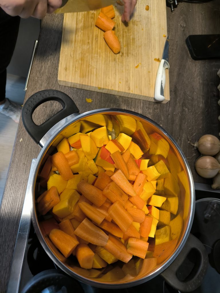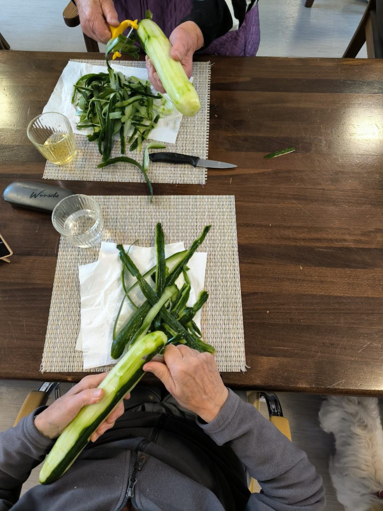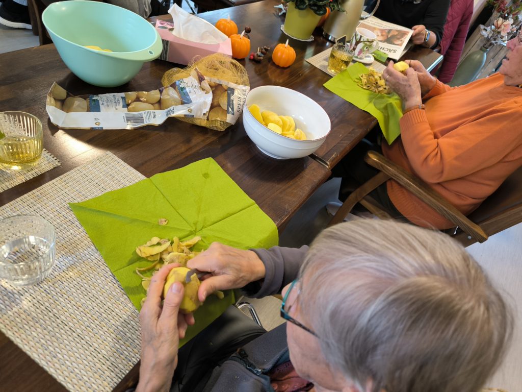 Natürlich wurde auch herbstlich gekocht. Alle Gäste schnipselten und schälten eifrig mit. So entstanden gesunde, frisch zubereitete Mittagsessen. Und da der Kürbis sehr vielseitig ist, kreierten die Gäste noch eine Kürbissuppe und einen Kürbiskuchen.